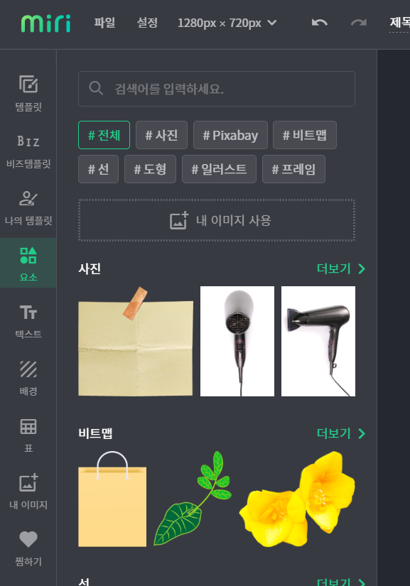 좌측에서 요소를 누르면 이미지 편집해 사용될 각종 요소들이 나타납니다. 요소 중에는 사진도 있고 선 그리고 도형.. 일러스트 프레임 등이 있습니다.. 전체적인 요소들의 특징을 보려면 전체 버튼을 눌러서 확인해 보시기 바랍니다.