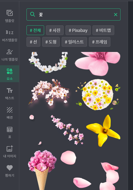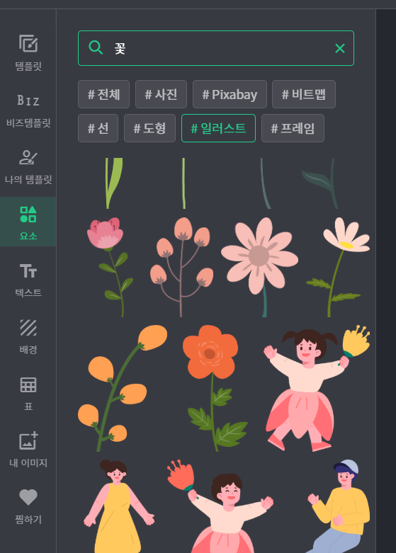꽃으로 검색된 상태에서 일러스트를 선택해 봤습니다. 그랬더니 디지털로 그려진 예쁜 그림이 검색 되어졌습니다. 이런 그림이 사진 보다 더 좋은 이유는 편집하고 있는 화면에 참가 시켜도 다른 이미지를 가리거나 방해하지 않습니다. 그러므로 좀더 유연한 편집을 할 수 있게 되는 것이죠.
