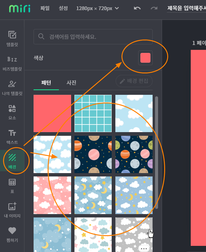 배경 색깔도 마음껏 조절할 수 있습니다. 단색으로 바꿔 줄 수도 있고 패턴을 선택할 수도 있습니다.