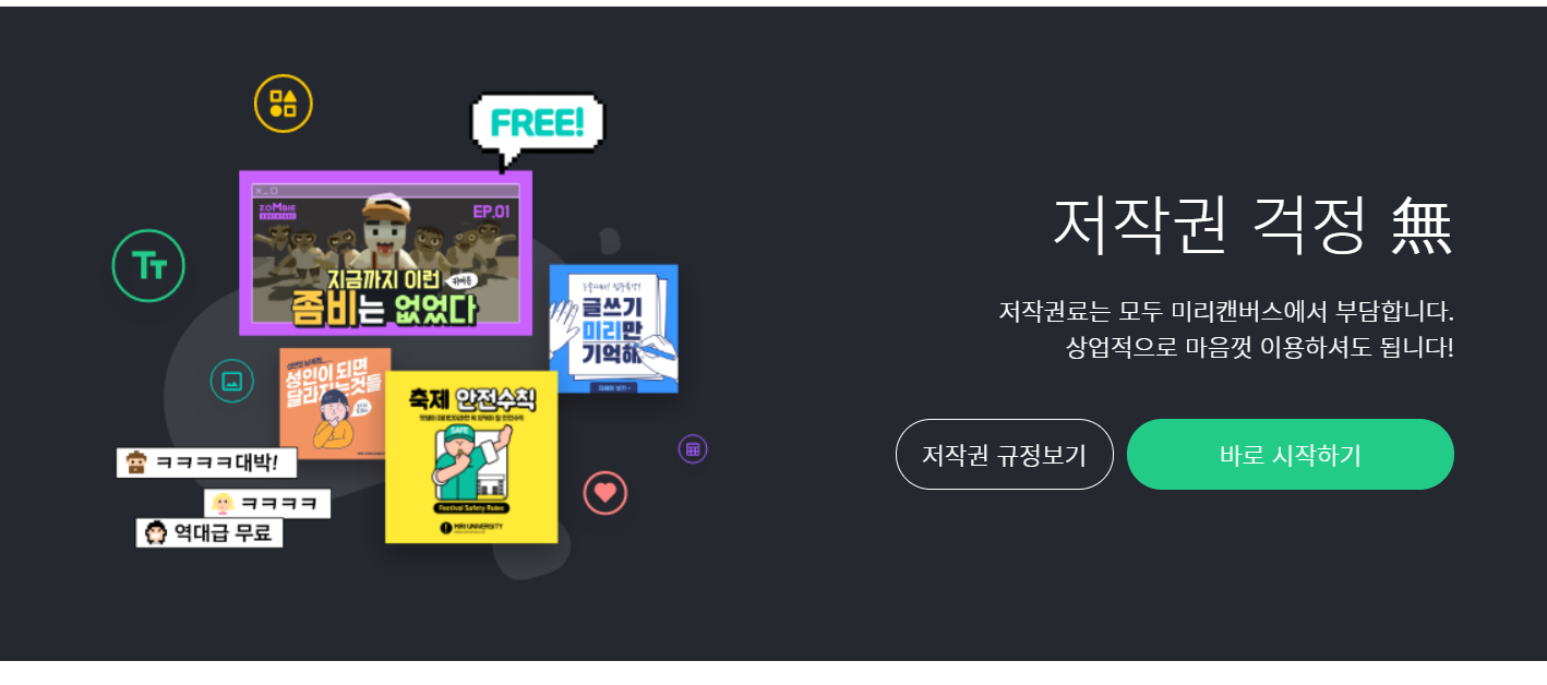 이건 미리캠퍼스에서 만드시는 이미지는 저작권에 대해서 걱정하실 필요가 없습니다. 사용하는 모든 이미지에 대한 저작권은 미리캔버스가 부담하고 있습니다. 그저 당신은 원하시는 곳에 마음 놓고 사용하시면 됩니다.