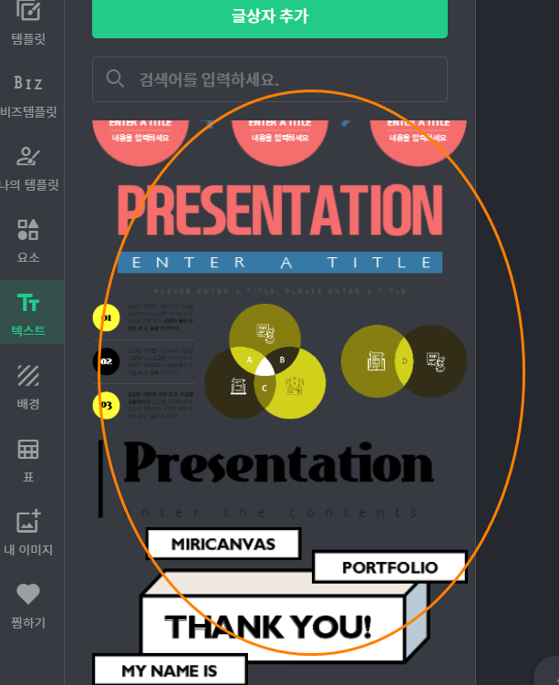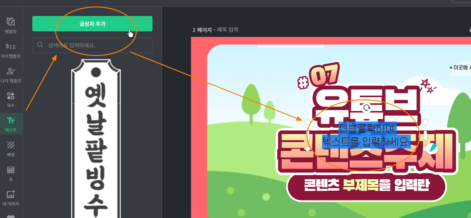 텍스트를 선택하신뒤 글상자 추가를 눌러 주세요.. 그러면 편집 화면에 빈 글상자가 첨부됩니다. 그러면 그 안에 텍스트를 입력하시고. 좌측에서 색깔과 그림자 테두리 등을 사용하여 효과를 넣어 줍니다.
