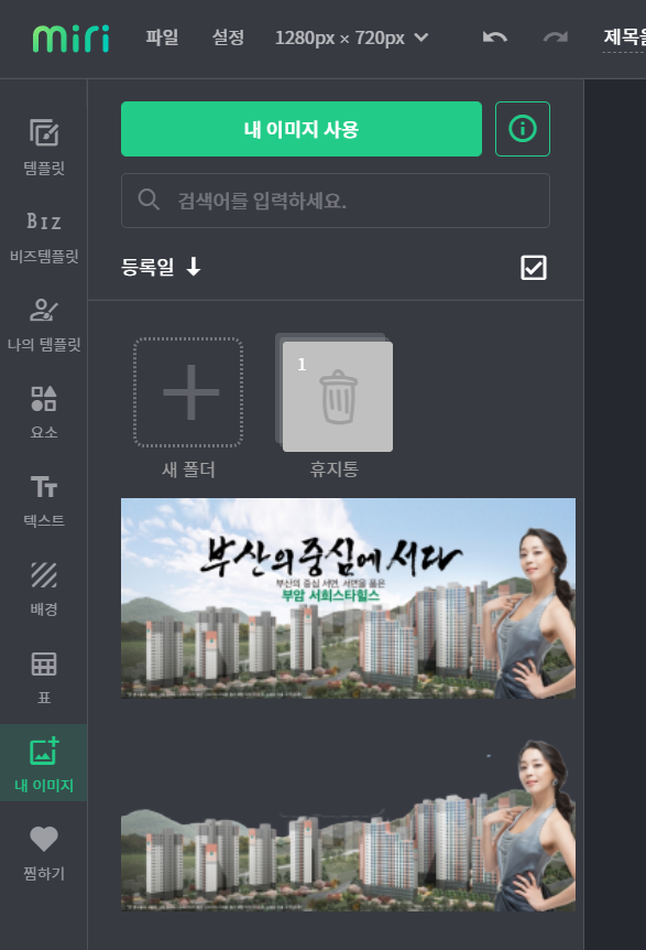 내 pc에 저장되어 있는 이미지를 불러와서 사용할 수도 있습니다. 내 이미지를 클릭한 뒤 내 이미지 사용을 클릭하여 저장되어 있는 이미지를 선택하면 아래 저장소에 표시됩니다. 포함된 아래 이미지 중에서 내가 편집 내 포함시킬 이미지를 그러다가 편집하면 내려 놓으면 요소로서 포함이 됩니다.