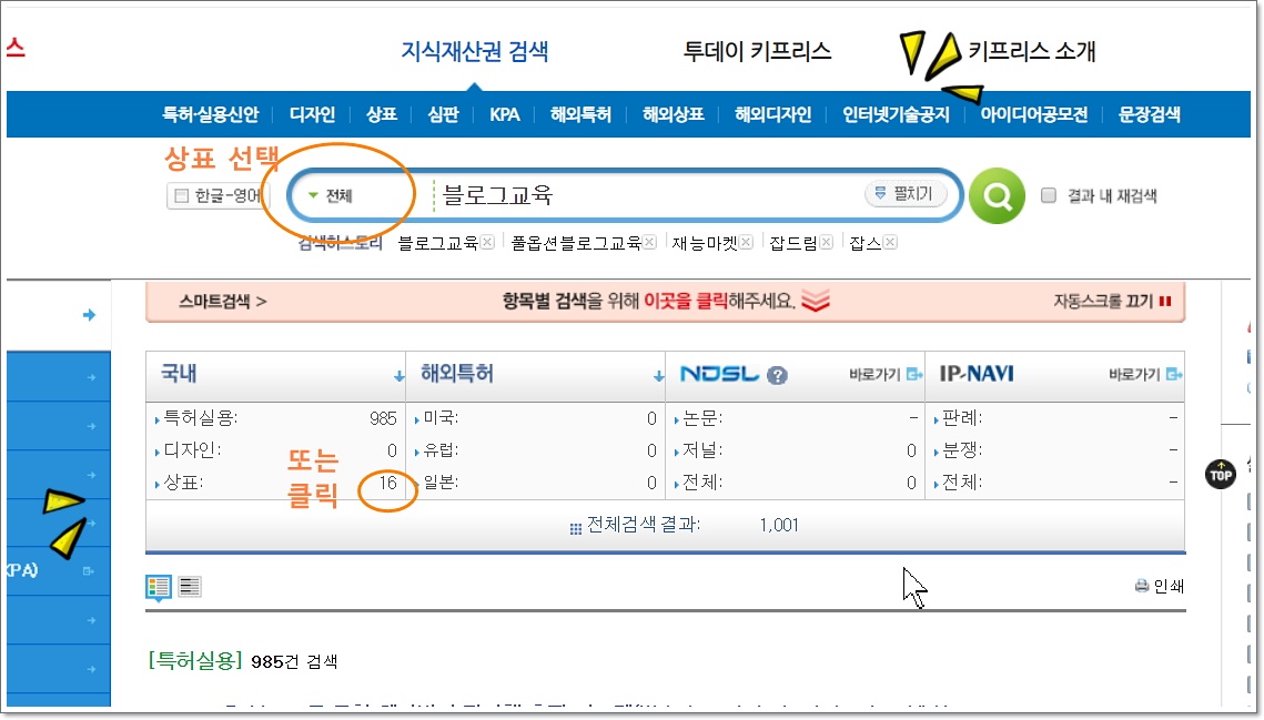 정보의 양이 너무 많으니까 상표만 검색합니다. 검색 입력란 앞에 보이는 전체를 눌러서 상표를 선택합니다.