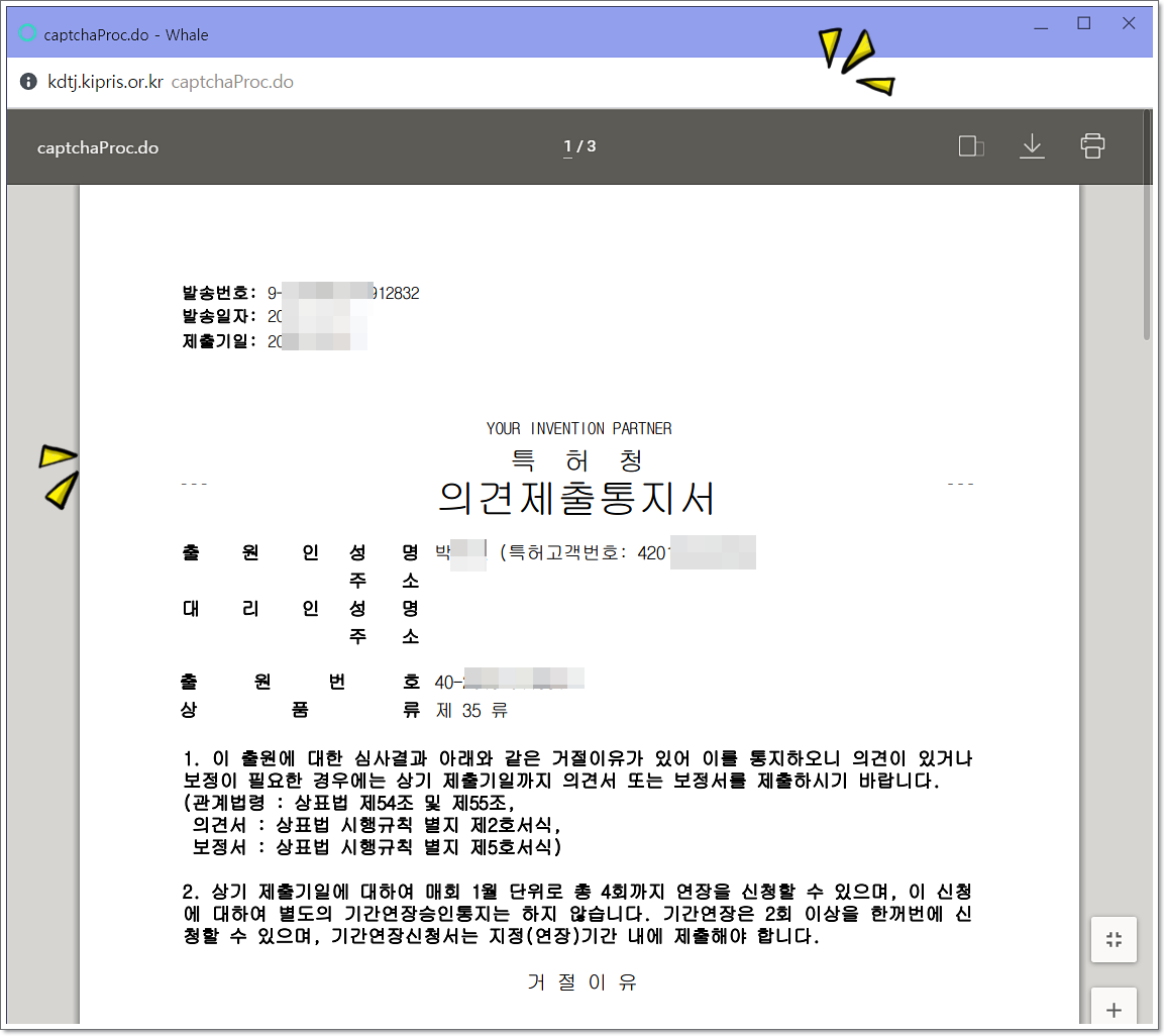 직접 제가 출연한 상표를 예로 들겠습니다. 제가 상표를 하나 출연했는데 의견 제출하라고 통보가 왔습니다. 이것은 다른 말로 거절을 당했다는 뜻입니다.