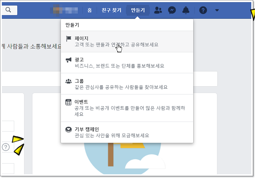 일단 페이스북에서 페이지를 만들려면 만들기 버튼을 누르고 페이지를 선택해 줍니다.