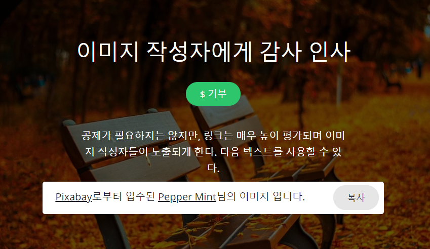 그래도 이미지를 제공해 주는 사람에게 기부를 할 수 있는 버튼이 나타나네요. 하지만 알고 있습니다. 이러한 기부가 실제로 이루어지기까지는 얼마나 힘든 일인지 말입니다. 대부분의 사람들은 고마워 하기는 하지만 내 돈을 쓰기는 싫어합니다. 이렇게 말하고 있는 저도 언젠가는 기부를 할 수 있는 날이 오기를 스스로 기원해 봅니다.