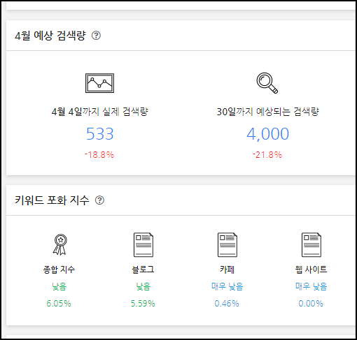 가장 중요한 데이터는 그 아래 보이는 키워드 포와 지수입니다. 키워드 포화 지수는 아까 위에서 보여 줬던 월간 검색량과 월간 문서 발행량을 백분률로 환산하여 보여주고 있습니다. 백분율 결과를 구간별로 나누어서 매우 낮음, 낮음, 보통, 높음, 매우 높음으로 인지하기 쉽게 보여줍니다.