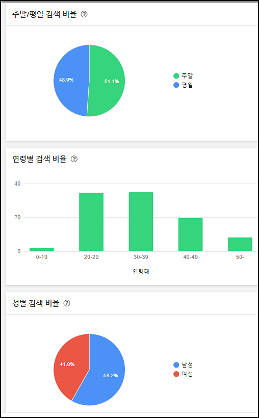 아래에서는 다양한 정보를 보여줍니다 주말과 평일의 검색 비율 그리고 연령별 검색 비율 또 성별 검색 비율을 보여줍니다. 이런 정보는 사실 유용하게 쓰일 만한 데이터는 아니기에 참고만 하시면 되겠습니다.