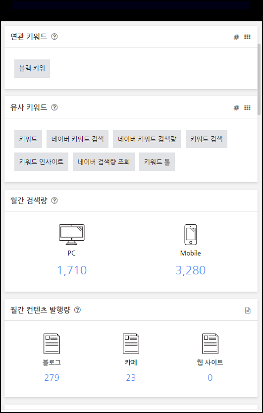 더 아래쪽으로 내려가면 월간 검색량이 보입니다. 친절하게도 피시에서 검색되는 검색량과 모바일의 검색량이 각각 별도로 보이게 됩니다. 그 하단에는 블로그 카페 웹사이트 영역에서 최근 한 달 동안 관련된 글이 몇 개나 발행됐는지 개수를 보여 줍니다.