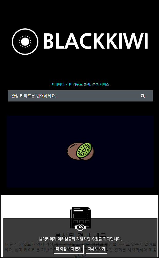 블랙키위의 메인화면 모습은 이렇습니다. 검색창에 당신이 생각해 놨던 키워드를 입력하여 검색해 봅니다.