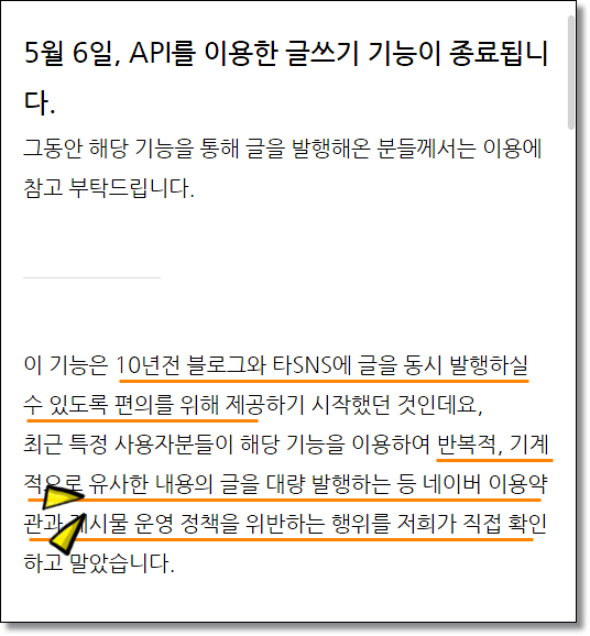 요번에 이렇게 만든 글쓰기 API를 네이버가 사용 종료를 선언한 것입니다. 왜 이런 선택을 했을까요. 이것에 대해서 지금부터 말씀드리겠습니다.