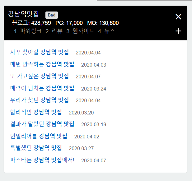 검색어에 대해서 네이버 블로그 검색을 해 보지 않아도 발행된 글들의 특징을 한눈에 확인할 수 있습니다.