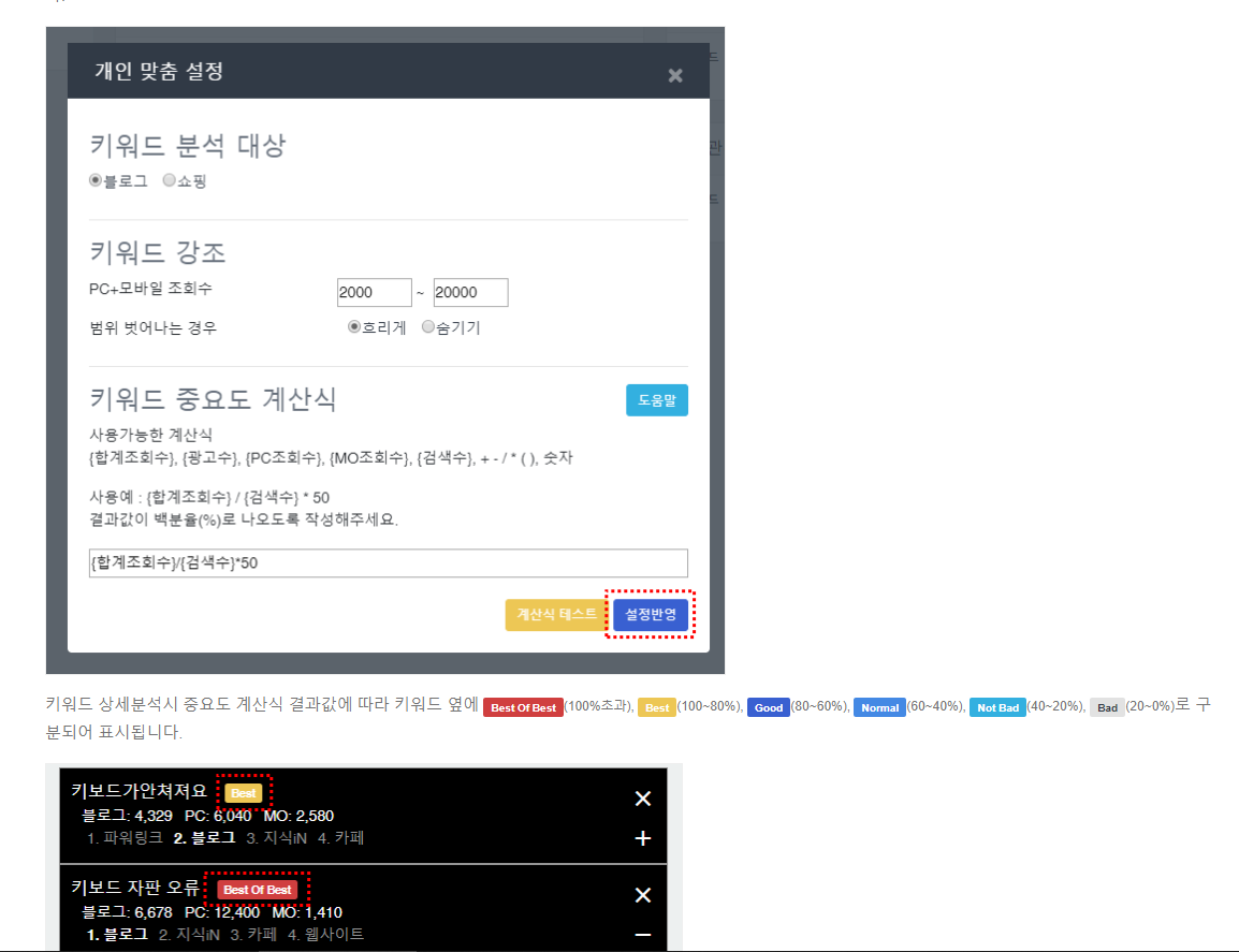 개인 맞춤 설정 부분으로 들어가면 키워드 검색시 진하게 표현해줄 키워드에 대한 조회수 범위를 설정하게 되어 있습니다. 또한 중요도를 표시할 범위를 설정할 수 있습니다. 개인의 블로그 등급에 따라서이 수치를 조절하면 나에게 딱 맞는 키보드를 좀 더 구별하기 쉽도록 표현할 수 있습니다.