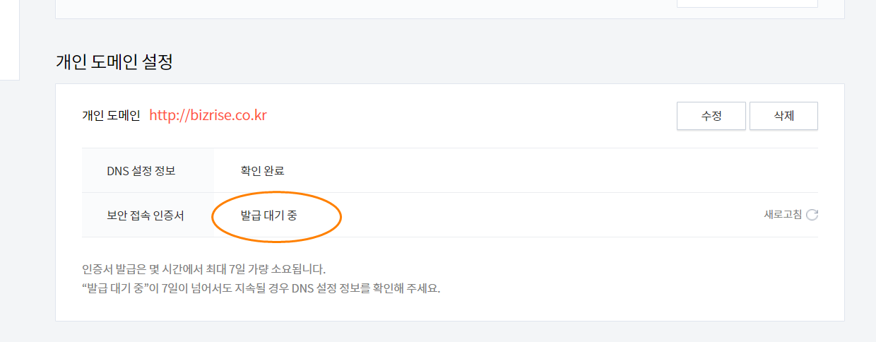 새로고침(f5)을 누르면 아래와 같이 보안 접속 인증서가 '발급대기중'이라고 뜹니다.