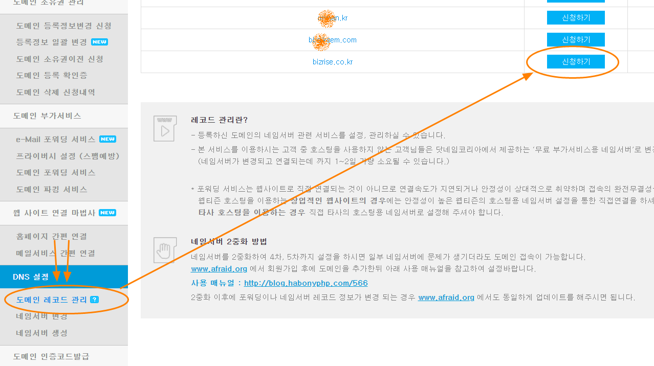 좌측의 메뉴에서 '도메인 레코드 관리'를 누르신 뒤