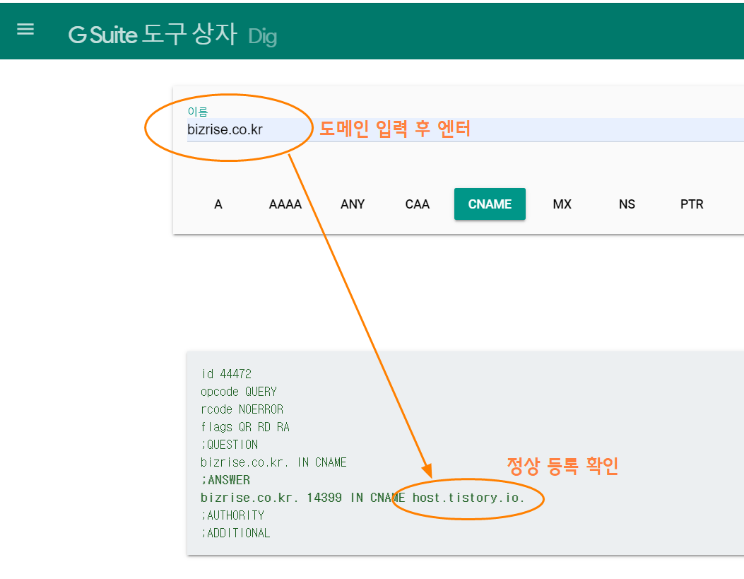 정확히 등록이 잘 되었으면 아래 처럼 'IN CNAME host.tistory.io'라고 뜬답니다. 안뜨면 위 절차를 자세히 잘 읽어보시고 틀린 곳이 없는지 꼼꼼히 살펴보세요.