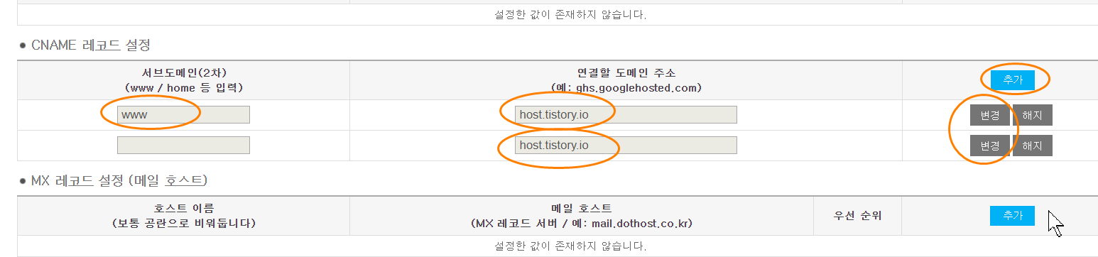서브도메인(2차) 입력란에 --> WWW 입력해주세요. 그리고, '연결할 도메인 주소'란에--> 'host.tistory.io'를 입력해주세요. --> 그리고 [변경] 클릭