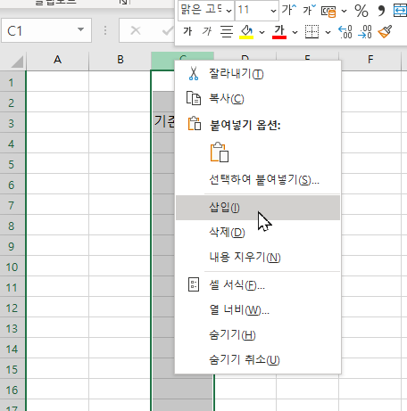 C열 앞에 새로운 열을 삽입 생성해보겠습니다.