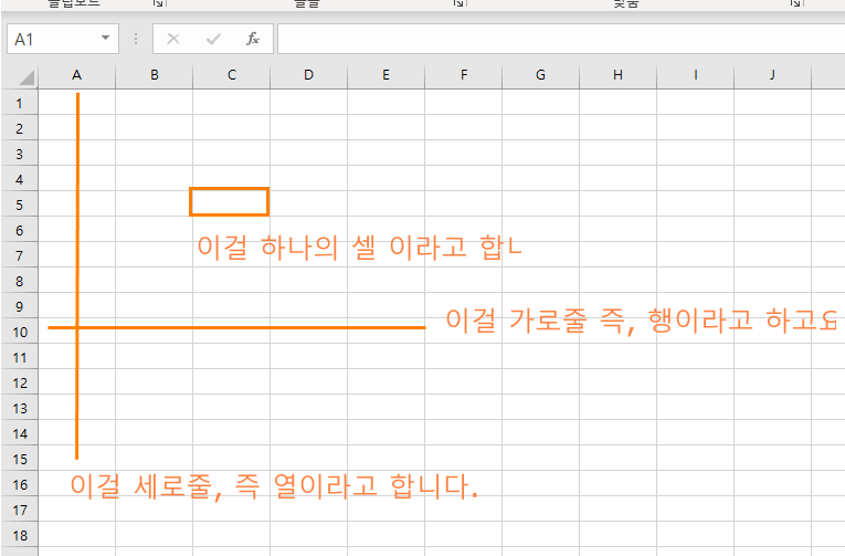 데이터가 입력되는 부분을 셀이라고 했는데요. 바로 셀은 그 셀이 위치한 행과 열의 이름을 붙여서 '주소'로 사용하게 됩니다.