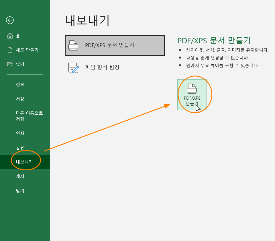 그리고 'pdf/xps 만들기'를 눌러주세요.