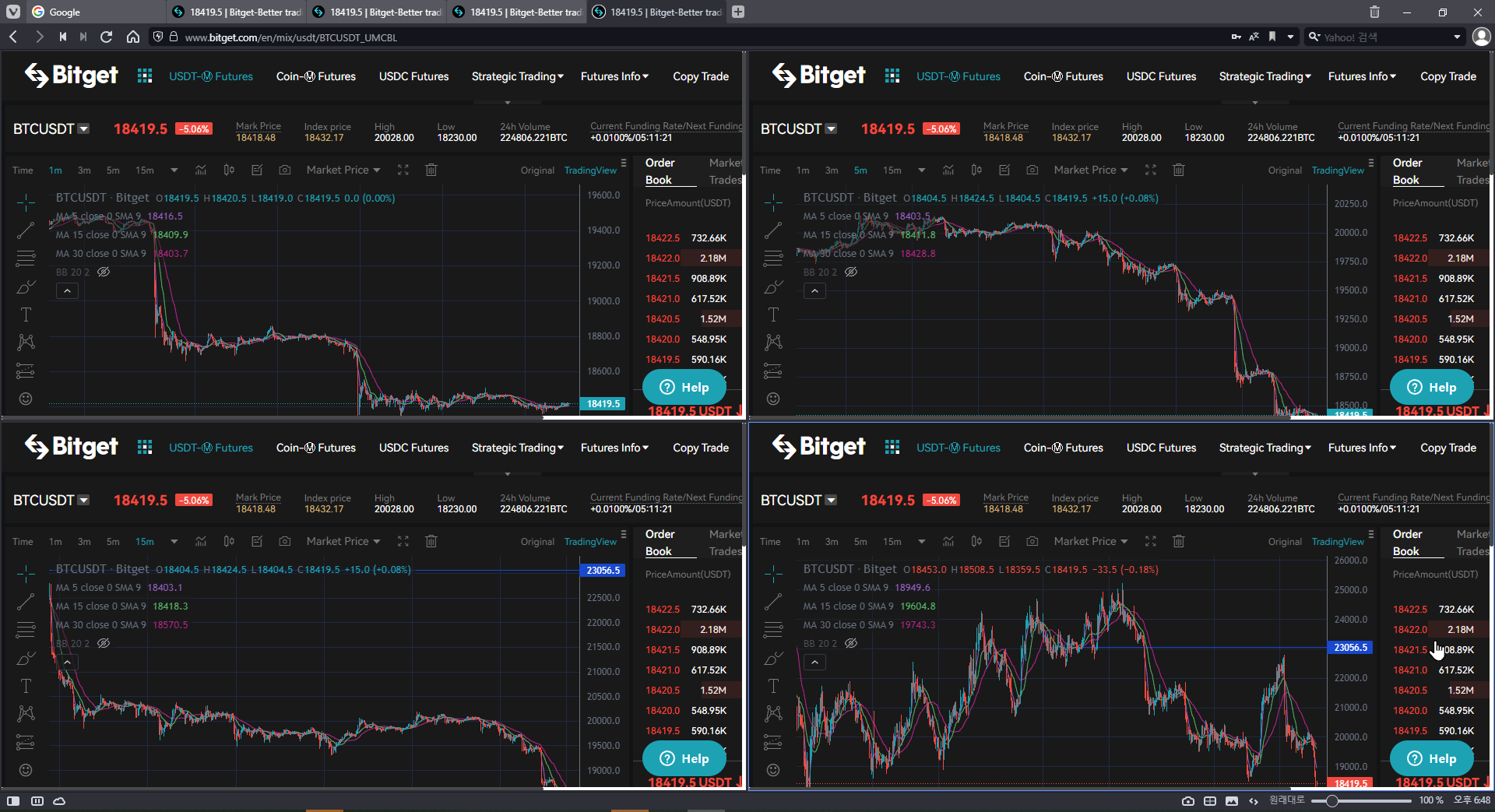 보통 전업으로 코임 매매를 하시는 분들은 화면 하나에 네개의 차트를 띄워놓고 보십니다.