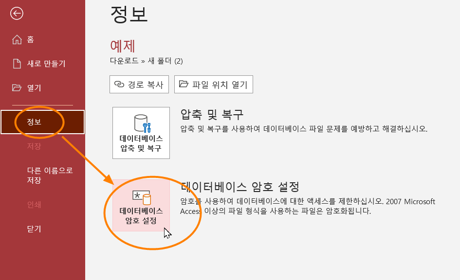 4. (파일 열린 후) '파일'메뉴 >> 정보 >> 데이터베이스 암호 설정