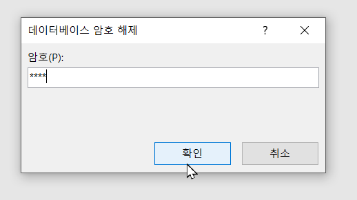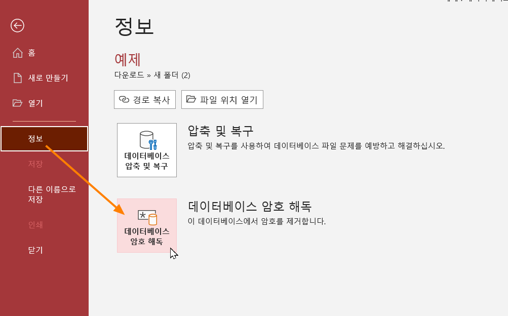 4. (파일 열린 후) '파일'메뉴 >> 정보 >> 데이터베이스 암호 설정