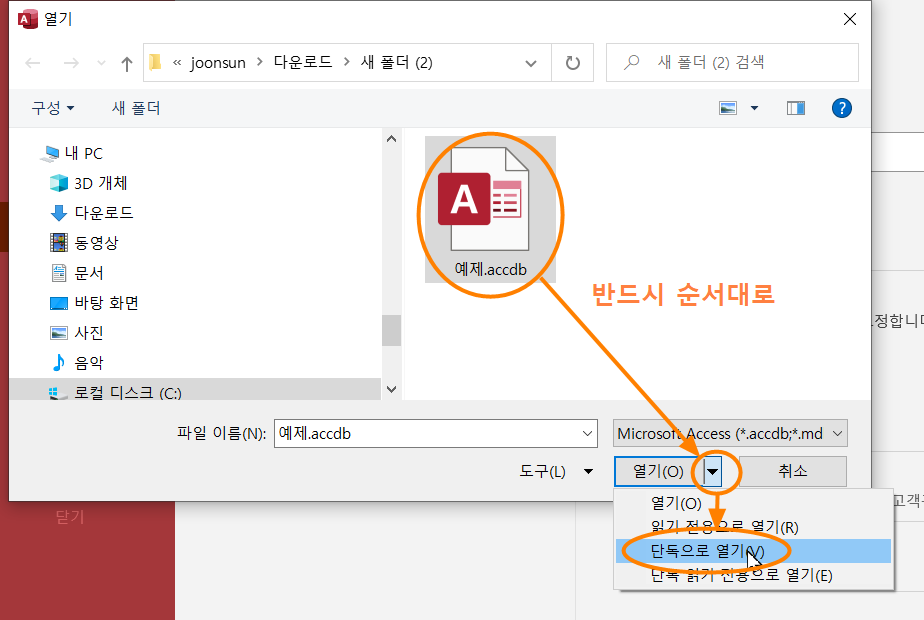 (1)파일 선택 --> (2) '단독으로 열기'를 눌러 여세요. 반대로 하면 실패합니다.