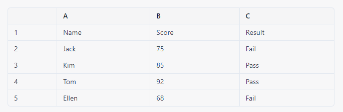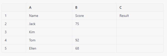 위의 표에서, IF 함수를 사용하여 B2:B5 범위 내의 모든 점수가 70보다 크거나 같으면 Pass, 작으면 Fail을 반환하는 예제가 있습니다. 이를 수행하는 방법은 다음과 같습니다.
