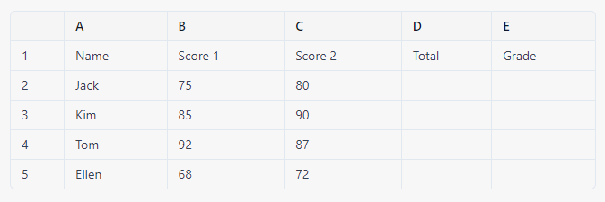위의 표에서, IF 함수를 중첩하여 사용하여 B2:C5 범위 내의 모든 점수의 총점과 성적을 계산하는 예제가 있습니다.