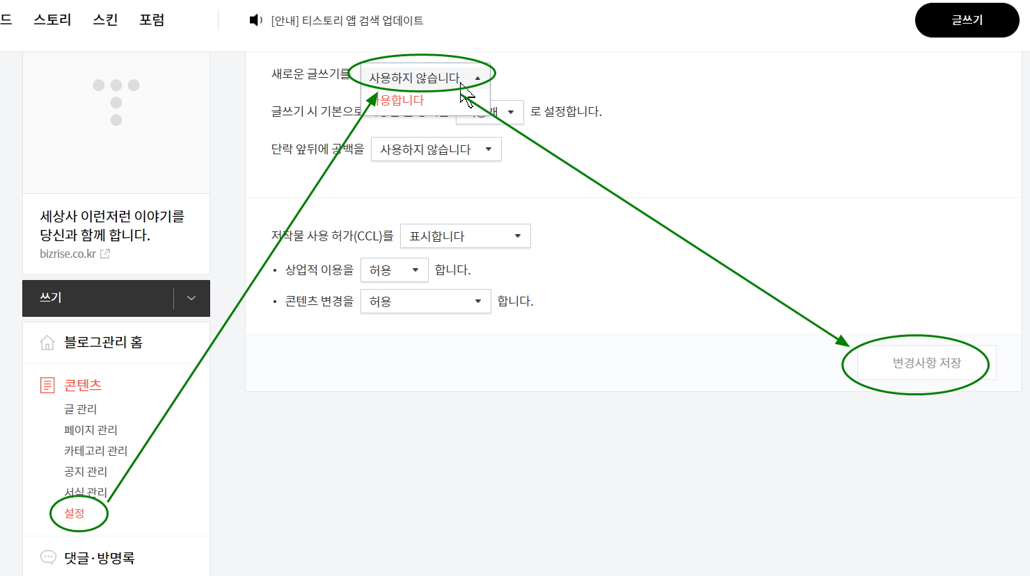 절대 새로운 글쓰기 에디터를 이용하면 안돼요.