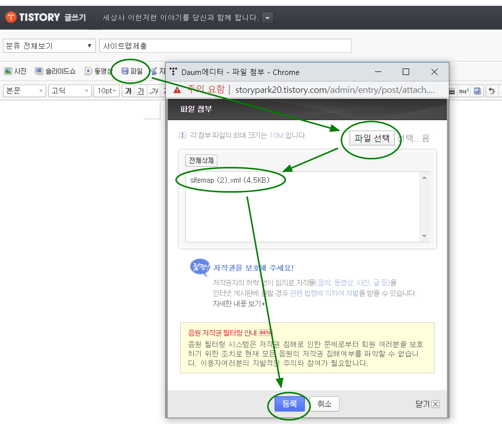 3. 비공개 새글에 사이트맵파일을 첨부한다.