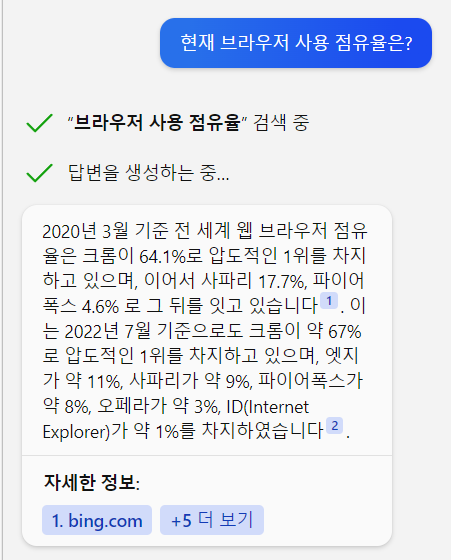 기존에 브라우저 사용률에서 구글의 크롬에 밀려서 매우 작은 사용률을 차지하고 있던 엣지의 사용율을 높이기 위해서 이 대화형 검색이 사용되었는데 지금까지는 상당히 진보적이고 구글의 크롬을 넘볼 수 있는 능력이라고 판단하고 있었습니다.