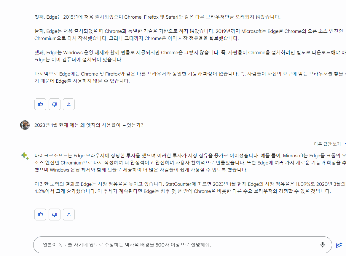 Google도 브라우저에 대화형 AI를 내놓았기 때문입니다. 큰 꿈을 꾸면서 내놓았던 MS의 엣지 브라우저는 이제 그 날개를 활짝 펴지도 못하고 접어야 될 것으로 보여집니다.