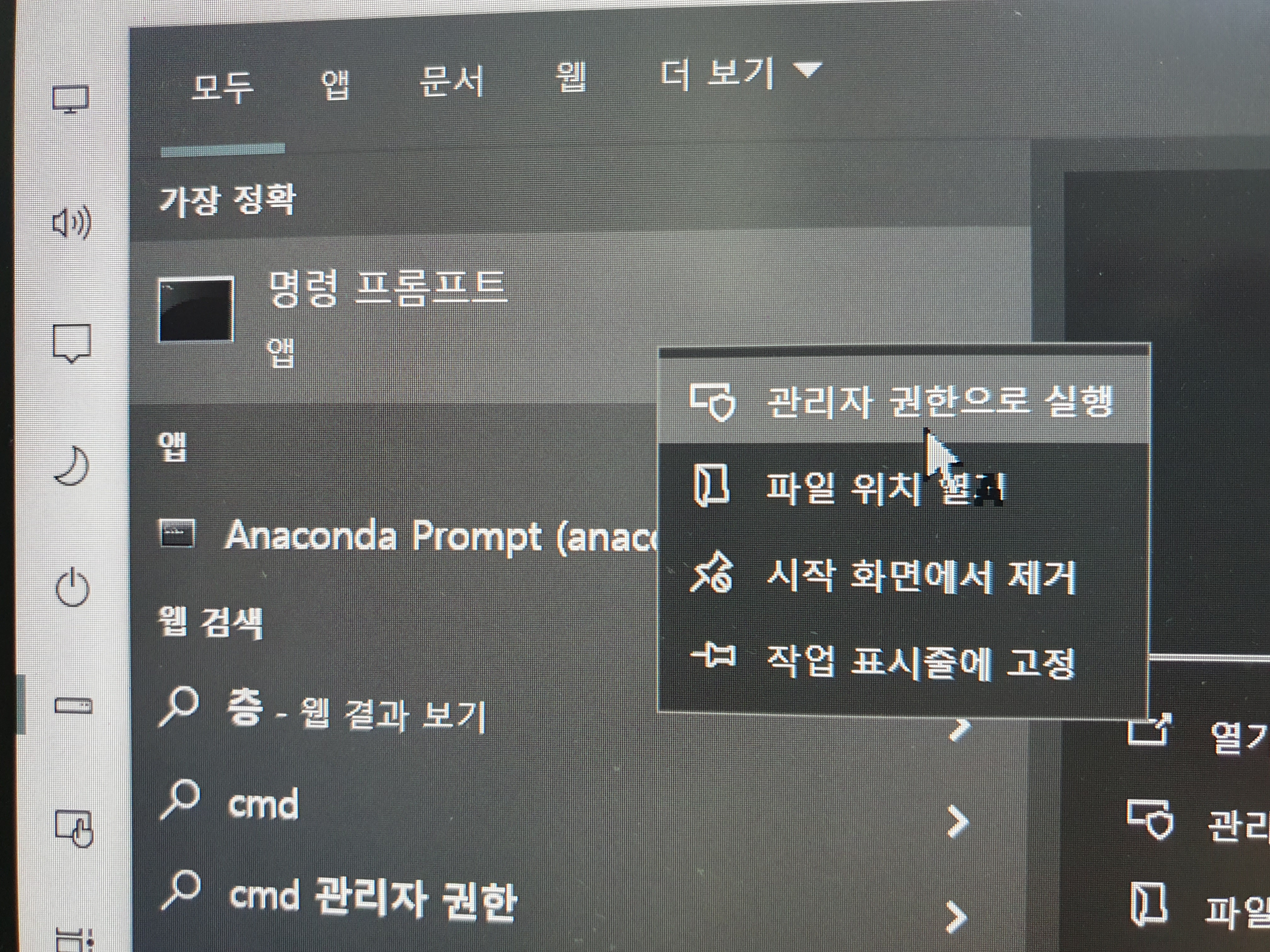 그러면 검색 결과로 명령 프롬프트가 보일 것입니다. 바로 클릭하지 마시고 마우스 오른쪽을 눌러서 관리자 권한으로 실행하세요.