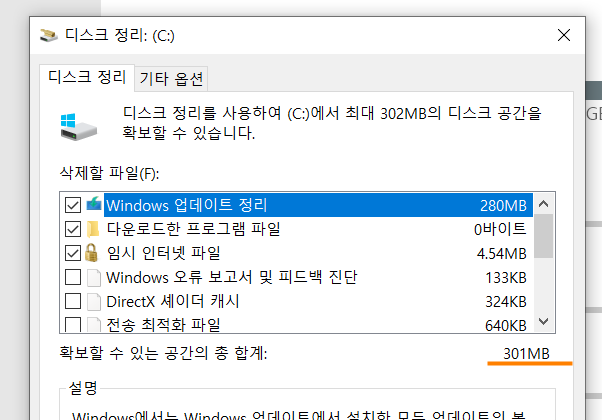 디스크 정리라는 기능을 이용하여 저장 공간을 확보하려고도 해 봤습니다. 하지만 윈도우 업데이트 정리와 다운로드한 프로그램 파일을 정리하고 임시 인터넷 파일을 정리한다고 한들 제가 확보할 수 있는 용량은 300메가바이트 밖에 없었습니다. 이것으로는 내가 여유롭게 컴퓨터를 활용할 수 있는 용량 확보는 어려웠습니다.