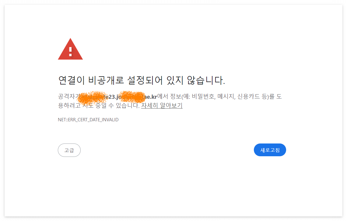 연결이 비공개로 설정되어 있지 않습니다.공격자가 rea****e23.joo*****ae.kr에서 정보(예: 비밀번호, 메시지, 신용카드 등)를 도용하려고 시도 중일 수 있습니다. 자세히 알아보기NET::ERR_CERT_DATE_INVALID