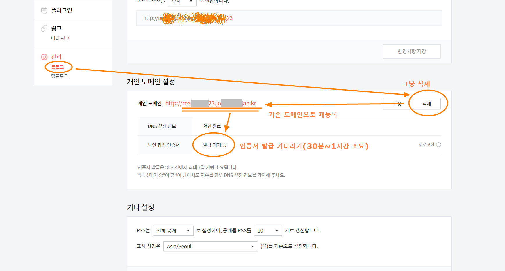 아래에서 보시다시피 순서대로 따라가시면 되겠습니다. 설정된 개인 도면을 삭제하고 다시 동일한 도메인으로 등록시켜 줬습니다. 그러니까 발급 대기 중으로 뜨더군요.
