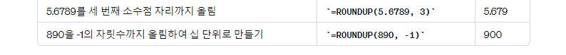 2. 123을 -2의 자릿수까지 올림하여 백 단위로 만들기: `=ROUNDUP(123, -2)` 결과는 200이 됩니다.
