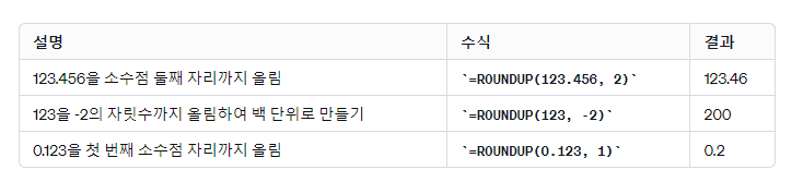 3. 0.123을 첫 번째 소수점 자리까지 올림: `=ROUNDUP(0.123, 1)` 결과는 0.2가 됩니다