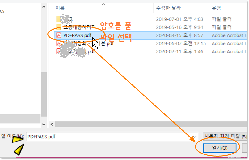아래처럼 암호를 해제 할 파일을 선택한 후 열기를 눌러 주세요.